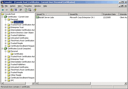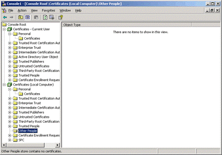 For more information about the certificate stores and the Certificate snap-in for the Microsoft Management Console (MMC), search for “Certificate console” in Windows XP, Windows Server™ 2003, or Windows 2000 Server Help.