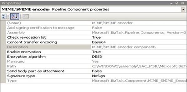 The figure above shows the settings for the MIME/SMIME encoder pipeline component where we enable the encryption and we choose the “DES3” encryption algorithm. In this example we are not going to sign the messages so we select “NoSign” for the signature sign.
